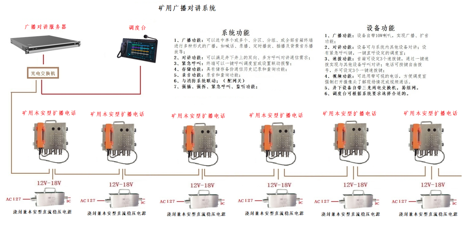 礦用本安型擴音對講廣播系統(tǒng)是由本安型廣播分站、臺式話站、本安電源、交換機組成的一套極簡擴音對講廣播系統(tǒng)。不需要服務器、電腦等,只要有網(wǎng)絡和電源,能實現(xiàn)井下、井上互撥對講,擴音喊話、各種廣播形式。同時有很強的拓展性和兼容性,可通過增設設備,來實現(xiàn)系統(tǒng)融合、互聯(lián)互通、報警聯(lián)動等功能。